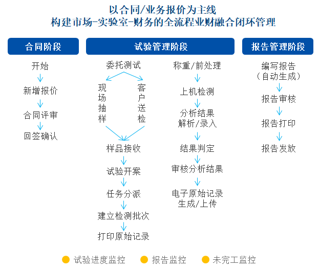 • 檢測業務信息化:可覆蓋實驗室從合同審批、委托下單、樣品管理、資源調度、檢測記錄、報告管理、財務開票結算等全業務的過程管理。支持通過手機、平板、二維碼、RFID、移動支付、全電票等技術提升管理效率;