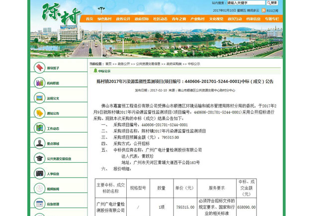 2月10日,廣電計量憑借商務(wù)技術(shù)得分的明顯優(yōu)勢,以總分第一的成績成功中標佛山市順德區(qū)陳村鎮(zhèn)2017年污染源監(jiān)督性監(jiān)測項目,這也是廣電計量2017年在環(huán)境檢測領(lǐng)域的新春第一標。中標合同順利簽訂后,廣電計量將為順德區(qū)陳村鎮(zhèn)的污染源監(jiān)督性監(jiān)測提供科學(xué)公正的數(shù)據(jù)和專業(yè)的技術(shù)服務(wù)保障。