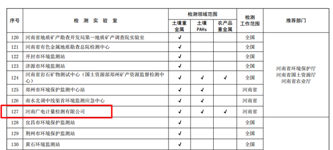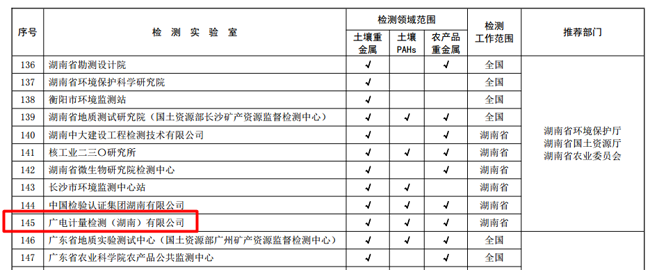 據悉,本次確定了首批233家檢測實驗室,當前主要承擔農用地土壤污染狀況詳查樣品分析測試任務,其中全國僅6家第三方專業檢測機構入選,廣電計量河南子公司、湖南子公司,以全項目(土壤重金屬、土壤PAHs、農產品重金屬)64項檢測標準全部通過的優異成績上榜,展現了在土壤檢測領域的過硬技術實力。