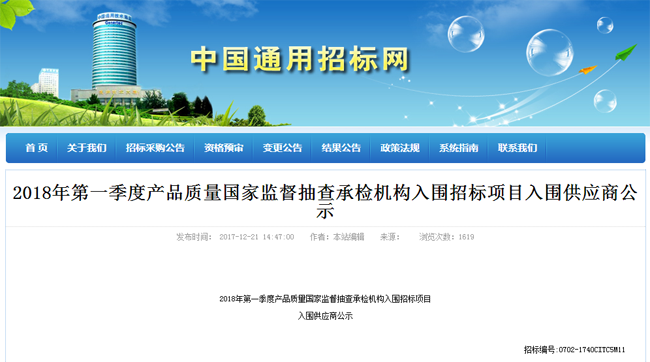 2017年12月21日,方圓廣電檢驗檢測股份有限公司(簡稱“方廣檢測”)列入了“2018年第一季度產(chǎn)品質量國家監(jiān)督抽查承檢機構入圍招標項目”入圍供應商。