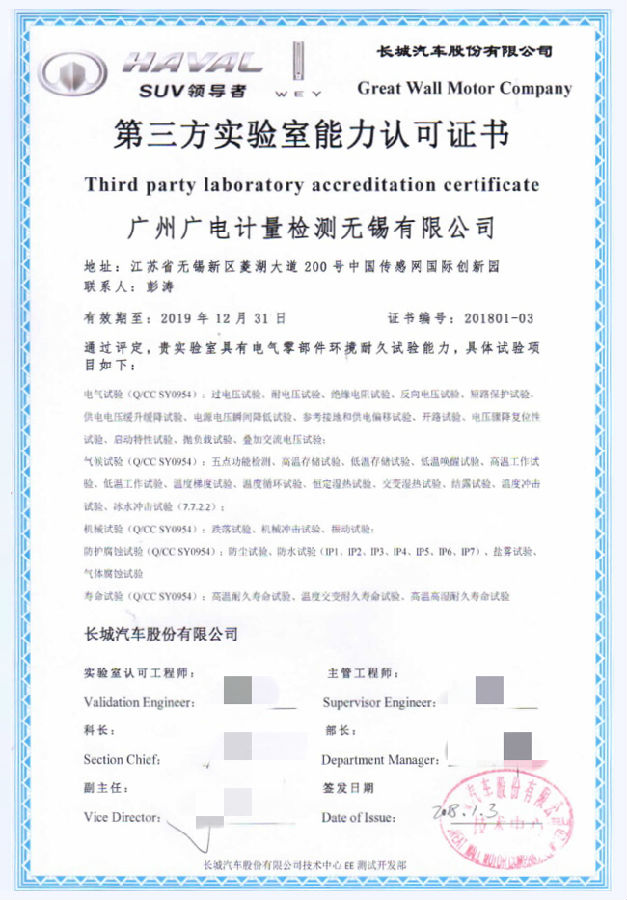 無錫子公司獲得長城汽車電氣零部件環境耐久試驗授權認可