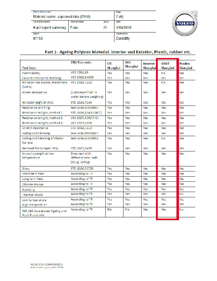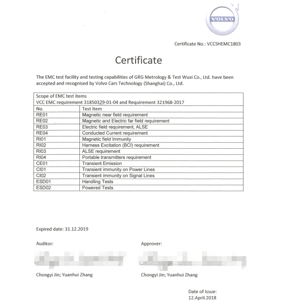 日前,廣電計(jì)量上海可靠性與環(huán)境試驗(yàn)實(shí)驗(yàn)室、無錫電磁兼容檢測(cè)實(shí)驗(yàn)室先后成為沃爾沃汽車技術(shù)(上海)有限公司(以下簡(jiǎn)稱“沃爾沃”)授權(quán)認(rèn)可的第三方實(shí)驗(yàn)室,認(rèn)可范圍覆蓋電磁兼容測(cè)試、高分子材料試驗(yàn)、表面材料和循環(huán)腐蝕試驗(yàn)等各大類別。此前,廣電計(jì)量無錫子公司還順利獲得了眾泰汽車ELV檢測(cè)的第三方實(shí)驗(yàn)室認(rèn)可。廣電計(jì)量頻頻獲得國(guó)內(nèi)外知名汽車制造商授予的檢測(cè)資質(zhì),充分表明了合作伙伴對(duì)廣電計(jì)量技術(shù)能力、實(shí)驗(yàn)設(shè)備、人才團(tuán)隊(duì)、質(zhì)量管控等全方位綜合實(shí)力的肯定,為后續(xù)展開深入合作打下了重要基礎(chǔ)。
