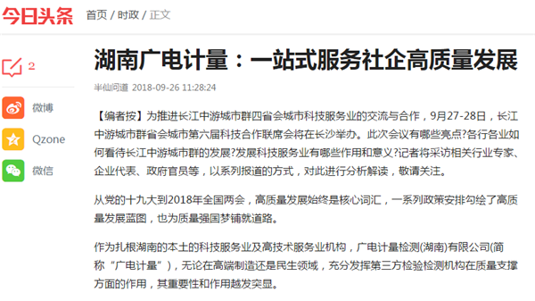9月27日,權威媒體《長沙晚報》對湖南廣電計量在科技服務領域的做法與經驗進行了詳細報道,今日頭條、政府部門網站等紛紛轉載報道,形成了廣泛的影響力。