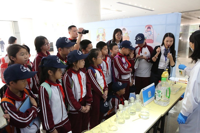 走進(jìn)互動體驗區(qū),接地氣的宣傳展板和各種有趣好玩的小實驗頓時吸引了小記者們的目光。瞬間變色實驗、火山噴發(fā)實驗、手機(jī)電磁輻射檢測……孩子們目不轉(zhuǎn)睛地盯著技術(shù)人員的操作,現(xiàn)場不時傳出陣陣驚嘆。