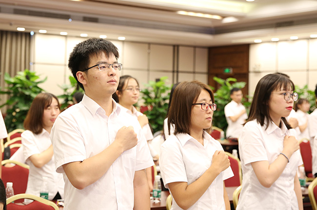 每一位剛剛走上職場道路的新人,都渴望能有一個“師傅”指引自己快速成長。在廣電計量,為幫助應屆生在各自崗位上迅速成長,公司建立了完善的應屆生系統培養體系,為每一位應屆生都配備了專業的職場領路人。會議最后,師傅代表與應屆生代表也先后上臺莊嚴宣誓,共表決心。