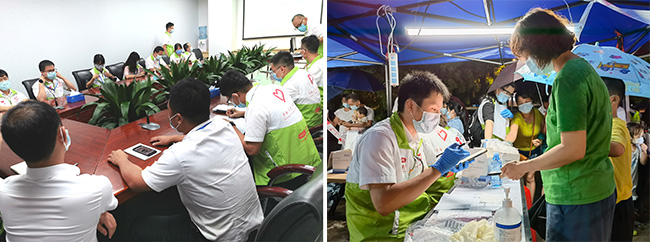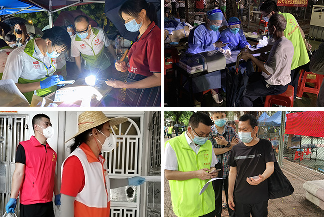 時而烈日當(dāng)空,時而大雨傾盆,惡劣的天氣無疑大大增加了防疫工作的難度。廣電計量黨員和團員志愿者無懼烈日風(fēng)雨,奔赴荔灣區(qū)、天河區(qū)的各個社區(qū)參與抗疫支援服務(wù)。他們有的負(fù)責(zé)維護(hù)現(xiàn)場秩序、有的負(fù)責(zé)引導(dǎo)檢測登記、有的負(fù)責(zé)為隔離居民送物資。