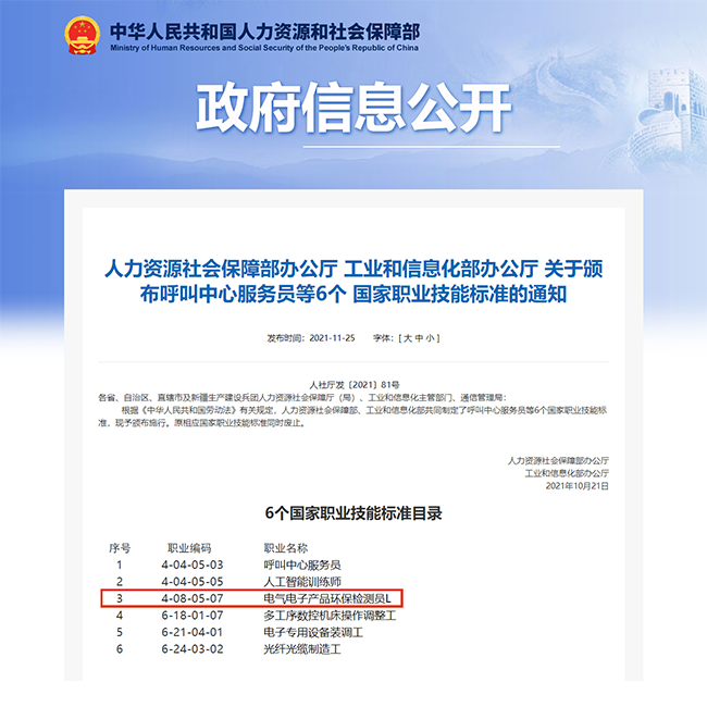 2020年2月25日,人社部、國家統計局、市場監督管理總局聯合向社會發布了16個新職業。其中,“電氣電子產品環保檢測員”作為“綠色職業”被正式納入國家職業分類目錄。這是自2019年國家新職業發布以來的第二批國家新職業,其中“電氣電子產品環保檢測員L”名列其中,是環保類的唯一新職業,也是工信部送審的5個新職業中唯一被專家評審通過的新職業,是對電氣電子產品環保從業人員的認可。
