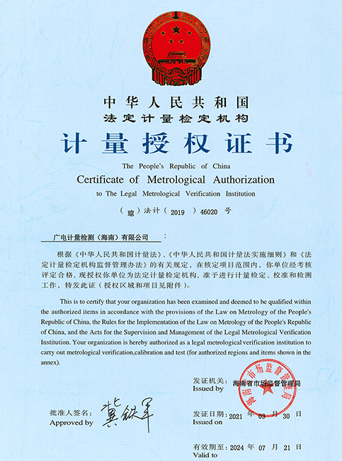 海南廣電計量是海南省市場監督管理局授權的法定計量檢定機構,計量授權證書號為:(瓊)法計(2019)46020號。公司組建了一支專業技術能力過硬的計量技術團隊,打造了一體化計量公共服務平臺;配置了0.005級活塞壓力計、E2等級砝碼、心電腦電監護儀等計量標準器具,建立了民用三表、充電樁、壓力儀表、砝碼、天平、多參數監護儀等多個計量標準,所建標準準確度等級高、性能穩定、測量范圍廣,達到國內先進的計量技術水平,滿足各行各業客戶高準確度、高精度計量的需求。