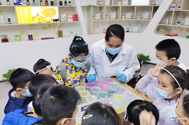 細菌長什么樣?通過觀看顏色、外觀各異的細菌培養皿,技術人員向學生強調要養成講衛生的好習慣。