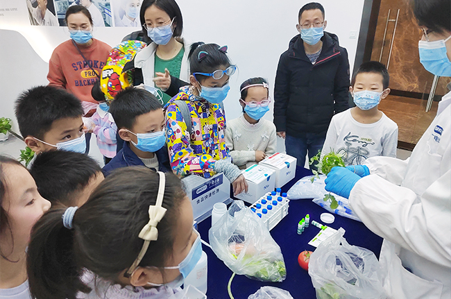 最后,小朋友們拿著提前從家里準備的蔬菜,交給技術人員進行快檢,確認蔬菜上的農藥殘留是否達標。