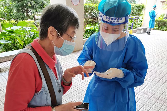 市場綜合黨支部黨員趙敬居住在白云區(qū),此前早已下沉社區(qū)多次支援,在4月8日當(dāng)天更是從晚上8點連續(xù)戰(zhàn)斗到第二天早上6點。“累一點不算什么,黨員就是要關(guān)鍵時刻站出來,重要時刻沖上去,這是我應(yīng)該做的。”趙敬說。這次來到白云支援點,她主要負責(zé)維護排隊秩序,一邊檢查居民健康碼和核酸碼,一邊關(guān)注老人、孕婦等群眾,把他們指引到綠色通道。看似簡單、重復(fù)的工作,卻時時考驗著志愿者們的耐心、細心。在這場爭分奪秒的疫情阻擊戰(zhàn)中,每個人都是不平凡的“逆行者”。