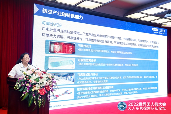 檢測傳遞著產業鏈上下游及消費者對產品的信心。在無人機蓬勃發展的今天,計量檢測機構為產品質量的確認與鞏固提供了重要的技術基礎。會上,針對無人機檢測市場目前仍處于市場起步階段,企業對無人機檢測存在著普遍的信息不對稱問題,廣電計量無人裝備及機器人技術副總監張曉瑾博士作主題分享,詳細介紹了無人機行業所面臨的主要產品質量及性能挑戰,分析了無人裝備目前的主要檢測需求,并向與會人員分享了廣電計量在無人機檢測領域的八大板塊能力,闡述計量檢測機構如何助力無人機產業高質量發展。