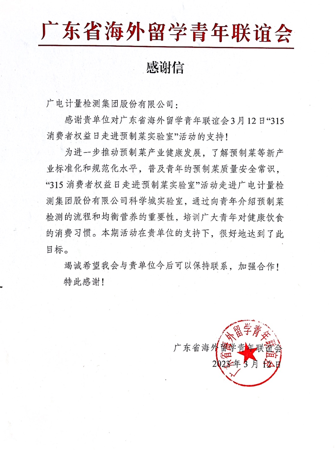 活動結束后,海青會向廣電計量發來感謝信,感謝廣電計量對此次活動的大力支持,并希望雙方整合資源、發揮優勢,共同助力預制菜產業健康持續發展。