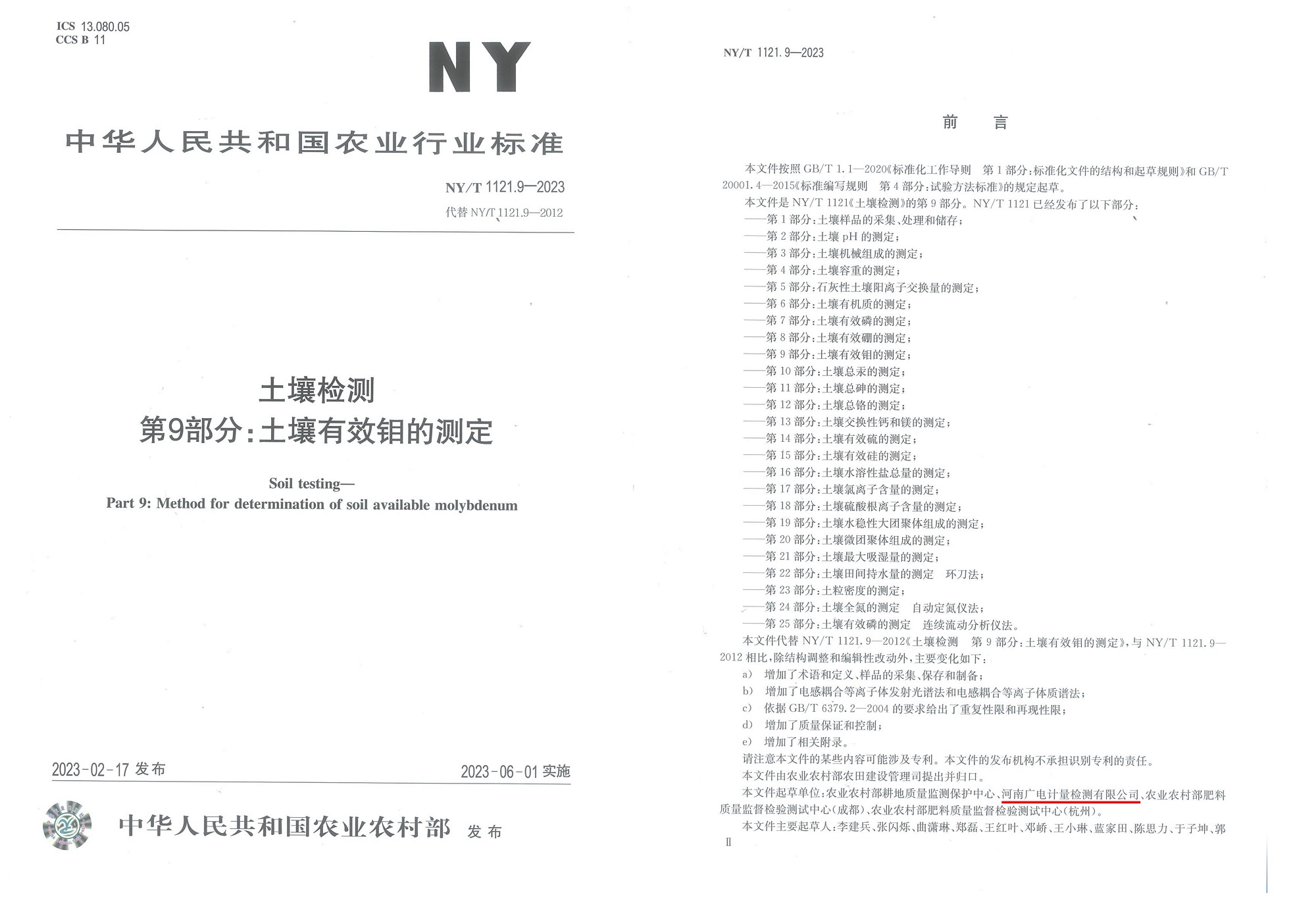 近日,農業農村部發布了中華人民共和國農業農村部公告第651號,《農作物種質資源庫操作技術規程 種質圃》等96項標準將于 2023年6月1日起實施。其中包括廣電計量檢測集團股份有限公司旗下子公司——河南廣電計量檢測有限公司、廣電計量(湖南)檢測有限公司參與起草的NY/T 1121.9—2023《土壤檢測 第9部分:土壤有效鉬的測定》和NY/T 1121.14—2023《土壤檢測 第14部分:土壤有效硫的測定》兩項行業標準。