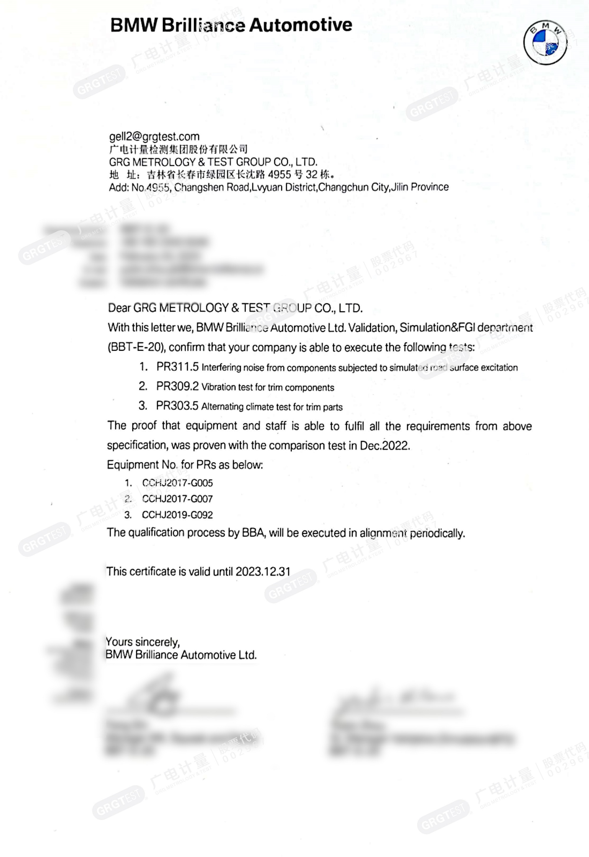 近日,廣電計(jì)量檢測(cè)集團(tuán)股份有限公司(簡稱“廣電計(jì)量”,002967.SZ)經(jīng)過嚴(yán)格審查,獲得華晨寶馬2023年的異響及環(huán)境可靠性測(cè)試與評(píng)估資質(zhì)認(rèn)可,成為國內(nèi)極少數(shù)可以執(zhí)行帶環(huán)境倉異響測(cè)評(píng)的第三方檢測(cè)機(jī)構(gòu)之一。