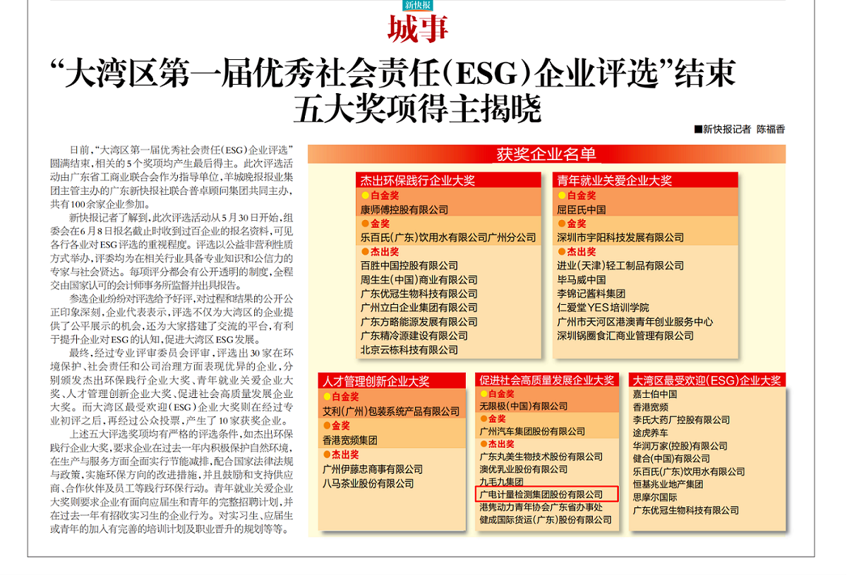 6月28日,由廣東省工商業(yè)聯(lián)合會(huì)指導(dǎo),羊城晚報(bào)報(bào)業(yè)集團(tuán)主管主辦,廣東新快報(bào)社、普卓顧問(wèn)集團(tuán)共同主辦的“大灣區(qū)第一屆優(yōu)秀社會(huì)責(zé)任(ESG)企業(yè)評(píng)選”頒獎(jiǎng)儀式在廣州舉行。憑借在產(chǎn)業(yè)布局、技術(shù)創(chuàng)新、環(huán)境保護(hù)和社會(huì)公益等方面的優(yōu)異表現(xiàn),廣電計(jì)量獲頒“促進(jìn)社會(huì)高質(zhì)量發(fā)展企業(yè)大獎(jiǎng)杰出獎(jiǎng)”,也是本次唯一入選的第三方計(jì)量檢測(cè)機(jī)構(gòu)。