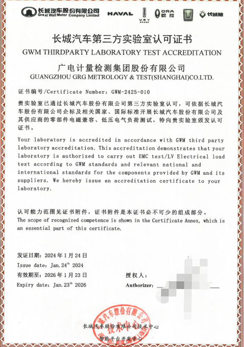 長城汽車第三方實驗室認可證書