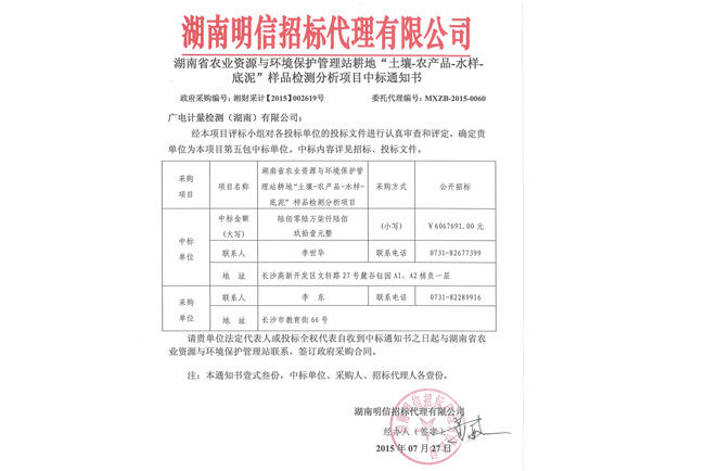 7月27日,GRGT湖南子公司,即廣電計量檢測(湖南)有限公司收到湖南明信招標代理有限公司發來的《中標通知書》,GRGT湖南子公司被確認為湖南省農業廳農業資源與環境保護管理站耕地 “土壤-農產品-水樣-底泥”樣品檢測分析項目(政府采購編號:湘財采計【2015】002619號)第五包中標單位,涉及樣品總量1.6萬個,總金額606.77萬元,中標合同順利簽訂后,GRGT將在長沙縣15個鄉鎮全面展開“土壤-農產品-水樣-底泥”樣品檢測分析,為耕地土壤重金屬污染防治提供科學、準確、可靠的檢測數據和治理建議。