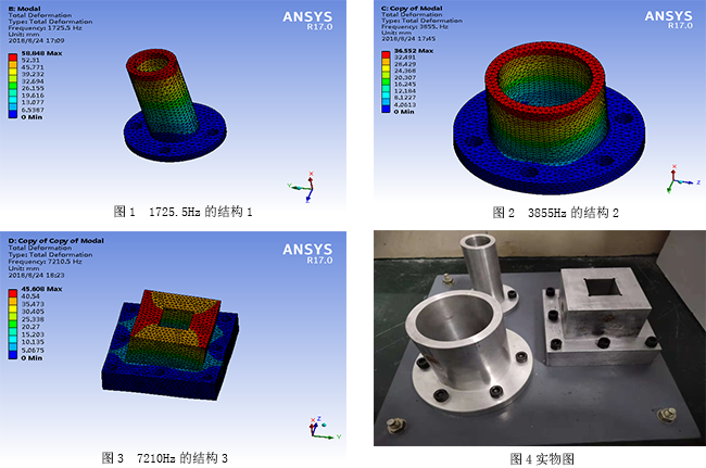 通過仔細(xì)分析帶電探傷儀工作原理可知,帶電探傷儀能通過激勵(lì)探頭和接收探頭共同作用,采用“一發(fā)一收”工作模式,獲取待測(cè)試結(jié)構(gòu)的一階固有頻率,通過一階頻率值判斷絕緣子是否發(fā)生了損傷。廣電計(jì)量瓷支柱絕緣子帶電探傷儀性能檢測(cè)系統(tǒng)根據(jù)帶電探傷儀的工作頻率范圍(100Hz~10000Hz),設(shè)計(jì)了三種一階頻率在此范圍的特殊結(jié)構(gòu)裝置——一端固定,一端自由的懸臂梁結(jié)構(gòu),并用有限元軟件進(jìn)行仿真,結(jié)果如下圖所示。(圖1~ 3為有限元仿真的三種結(jié)構(gòu)的一階固有頻率,圖4為制作的實(shí)物圖)