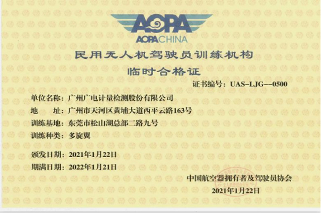 廣電計量咨詢培訓(xùn)事業(yè)部無人機(jī)飛行學(xué)院(以下簡稱學(xué)院)隸屬于廣州廣電計量檢測股份有限公司,是經(jīng)中國民用航空局授權(quán)、中國AOPA協(xié)會(中國航空器擁有者及駕駛員協(xié)會)審定合格的專業(yè)無人機(jī)駕駛員/機(jī)長訓(xùn)練機(jī)構(gòu)。學(xué)院通過培訓(xùn)無人機(jī)技術(shù)、無人機(jī)行業(yè)應(yīng)用、無人機(jī)操控等專業(yè)知識,協(xié)助學(xué)員通過民航無人機(jī)飛行考試,取得民航電子執(zhí)照,并引導(dǎo)學(xué)員成為無人機(jī)應(yīng)用行業(yè)一流應(yīng)用專才!