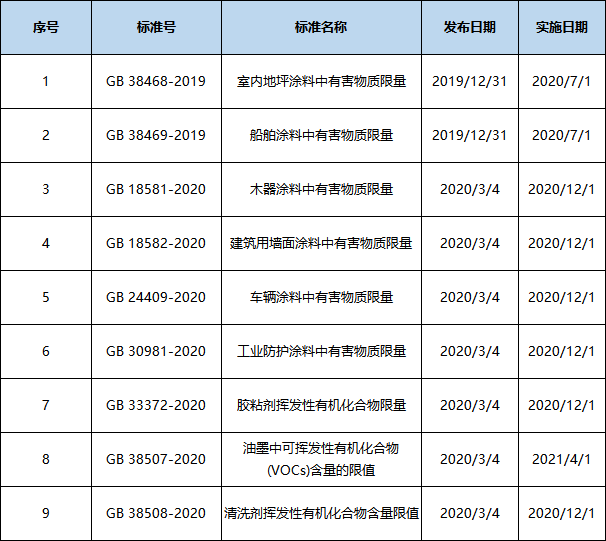 針對涂料、油墨、膠粘劑、清洗劑等四大類產(chǎn)品的相關(guān)VOCs含量限值標(biāo)準(zhǔn)均順利完成制定工作并發(fā)布。且已開始實施,屬于國家強(qiáng)制標(biāo)準(zhǔn)