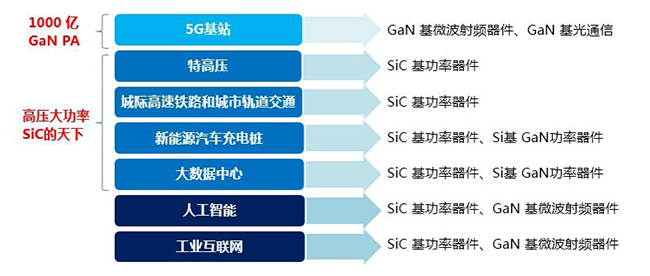 第三代半導(dǎo)體在新基建七大領(lǐng)域都有其廣泛的應(yīng)用前景。在5G基站領(lǐng)域, GaN PA(即氮化鎵功率放大器)是5G基站的最優(yōu)選擇,預(yù)計(jì)在2025年前,我國(guó) 5G 宏基站預(yù)計(jì)將建設(shè)超過500萬站,而5G宏基站、微基站、及毫米波基站帶來的GaN PA 市場(chǎng)規(guī)模將超過1000億元,而特高壓、高鐵和軌交、充電樁、大數(shù)據(jù)中心等高壓大功率領(lǐng)域都將是SiC的天下。