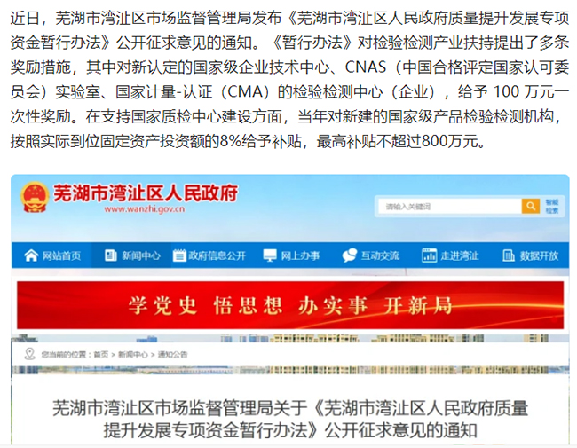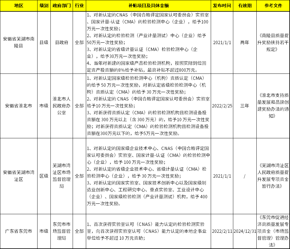 順應宏觀政策的利好,近日國內部分省市密集出臺了一批獎勵政策,對新認定的CNAS實驗室,CMA檢驗檢測中心至高開出了100萬元的一次性獎勵。