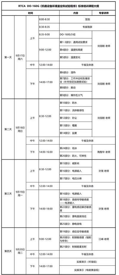 《機(jī)載設(shè)備環(huán)境條件和試驗(yàn)程序》全部試驗(yàn)原理及方法,包括通用實(shí)驗(yàn)要求:溫度、高度、溫度變化、濕熱、沖擊、振動、爆炸性大氣、防水、流體敏感性、砂塵、霉菌、鹽霧、結(jié)冰、防火、電源輸入、電壓尖峰、音頻傳到、感應(yīng)信號、射頻敏感度、射頻能量發(fā)射、雷電感應(yīng)、雷電直接效應(yīng)、磁影響、靜電放電共26部分。(涵蓋環(huán)境及電源特性,EMC二個(gè)測試技術(shù)領(lǐng)域),詳見課程大綱如下: