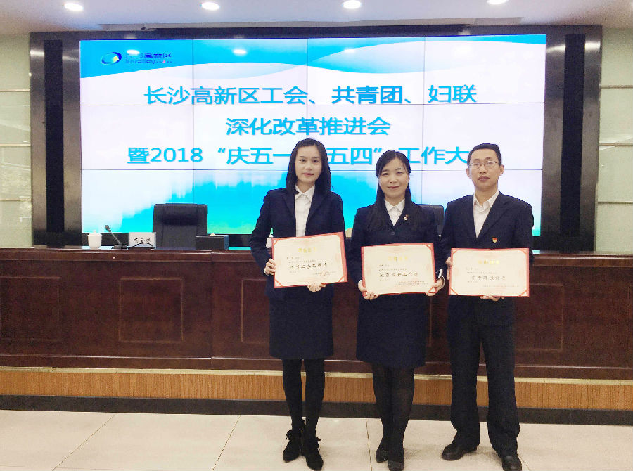湖南子公司向勇(右)、劉麗娜(中)、張琴(左)分別獲長(zhǎng)沙高新區(qū)工會(huì)“青年崗位能手”、“優(yōu)秀工會(huì)工作者”、“優(yōu)秀婦女工作者”稱號(hào)