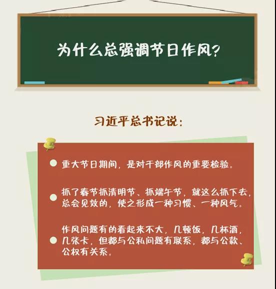 重大節日期間,是對干部作風的重要檢驗;中秋節、國慶節就要到了,要堅決剎住公款送節禮、公款吃喝、公款旅游和奢侈浪費等不正之風,過一個風清氣正的中秋節、國慶節。