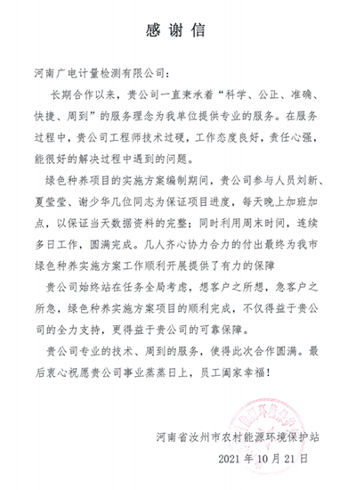 在汝州項目保障期間,時間緊,任務重,天氣突變,而劉新前一天晚上堅持工作到凌晨3點,第二天清早又趕到客戶辦公室,最終體力不支病倒了,團隊的同事們紛紛送上關切的問候,讓她回去休息,但劉新仍然堅持留在工作現(xiàn)場做好技術指導與工作協(xié)調(diào),她的拼勁為團隊注入強大的精神動力,大家一起堅守趕制完成報告,團隊又連夜從汝州趕回鄭州,陪同客戶如期將報告提交到政府主管部門。最終,試點實施方案順利通過,廣電計量的綜合能力獲得認可,并收到了客戶表揚信。