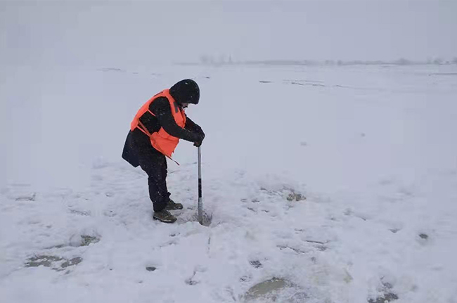 由于遇上風雪天氣,能見度極低,加上路上積雪太深,車輛無法靠近采樣點位,他們絲毫沒有退縮的想法,毅然選擇下車徒步前進。好不容易走過3公里鋪滿積雪的田野小路,來到預定的監測采樣點位,他們手腳都凍僵了,但也顧不上捂一捂、跺一跺,馬上拿出工具,采樣、裝瓶、記錄數據,4個小時下來整個采樣和監測流程有條不紊。采樣完成后,又原路返回車上,繼續奔赴下一個斷面采樣點。