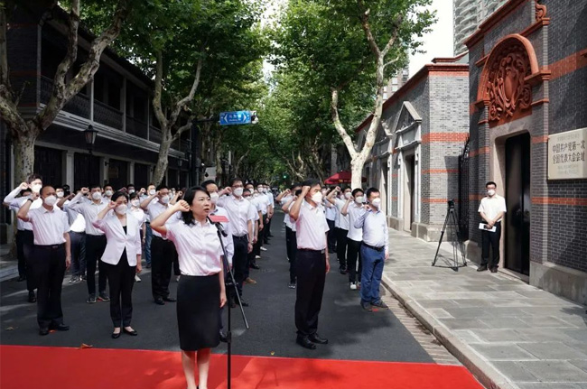 這是7月1日,上海市新黨員代表入黨宣誓活動在中共一大會址前舉行。當(dāng)日,中共一大紀(jì)念館舉辦多種教育活動,慶祝中國共產(chǎn)黨成立101周年。新華社記者劉穎 攝
