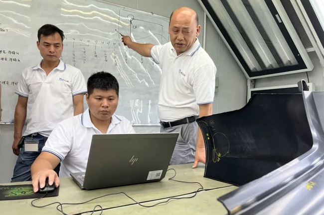 這是古顯善(右一)與技術(shù)團(tuán)隊討論模具制作圖調(diào)整方案。新華社記者趙瑞希 攝