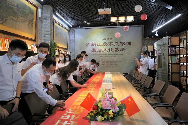 余蔭山房是嶺南四大園林之一,其原主人——番禺南村鄔氏家族傳承八百余年,家風清廉,賢人輩出。在學習教育現場,黨員們參觀了“百年鄔氏百年堂,清正家風永流芳”家風家訓廉潔文化主題展覽、家風學堂、勤廉廊、勤廉書吧等。