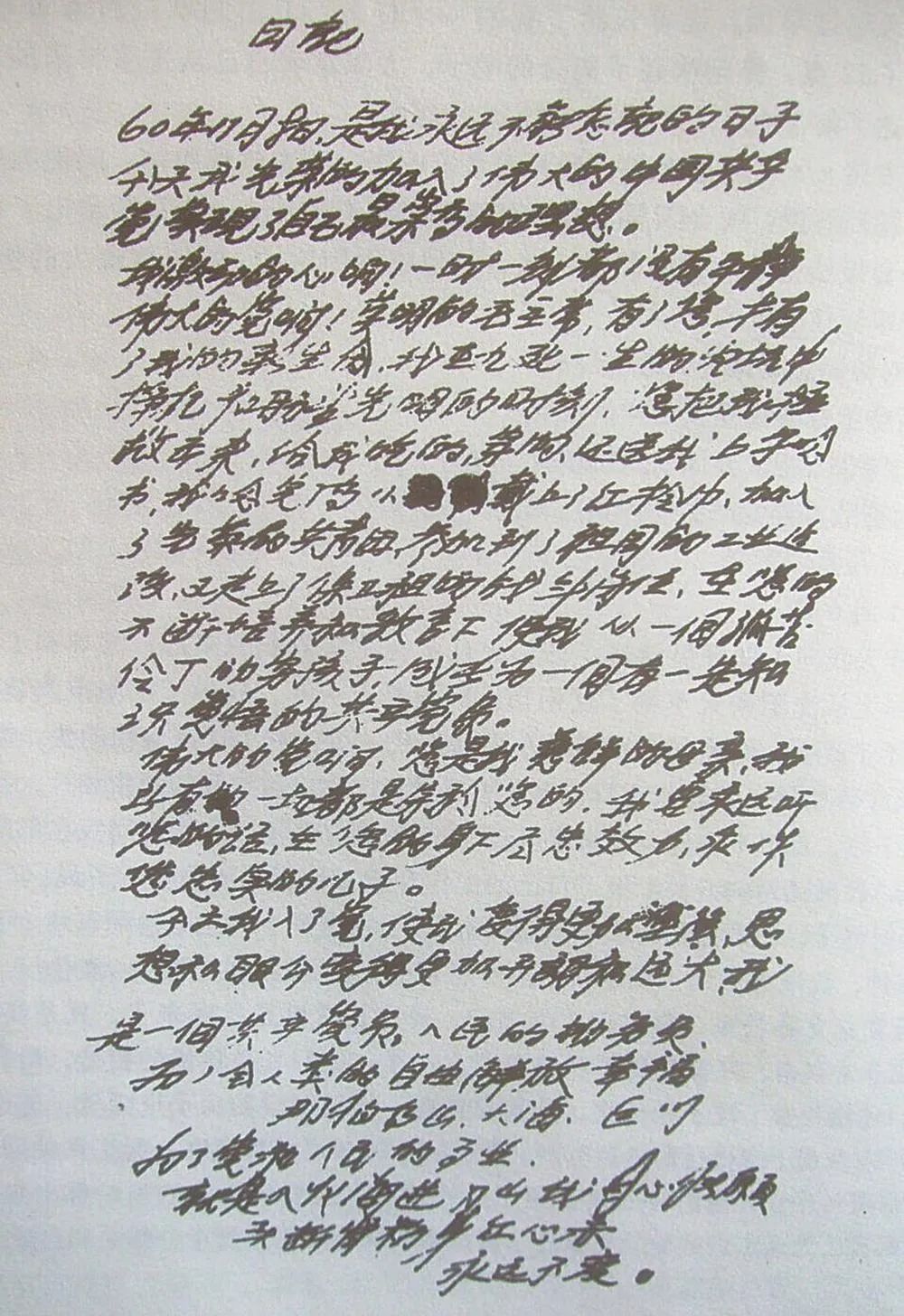 1960年10月的一天,在原沈陽(yáng)軍區(qū)工兵團(tuán)(工程兵10團(tuán))政委韓萬(wàn)金的辦公桌上,放著一份雷鋒的自述材料,題目是《解放后我有了家,我的母親就是黨》。這份材料的形成過程是這樣的:團(tuán)黨委樹立雷鋒為“艱苦奮斗、勤儉節(jié)約標(biāo)兵”以后,為使全團(tuán)同志具體了解雷鋒的先進(jìn)思想和模范事跡,韓萬(wàn)金責(zé)成政治處幫助雷鋒把他在舊社會(huì)的苦難遭遇和中華人民共和國(guó)成立后的成長(zhǎng)經(jīng)歷寫成材料印發(fā)各連黨支部。為此,政治處把雷鋒找來(lái)聽他詳細(xì)匯報(bào),邊聽邊記錄,整理成這份近萬(wàn)字的材料。最后讓雷鋒過目、修改、定稿,他做了些刪節(jié)和修改,并把《雷鋒同志模范事跡材料》改成《解放后我有了家,我的母親就是黨》。