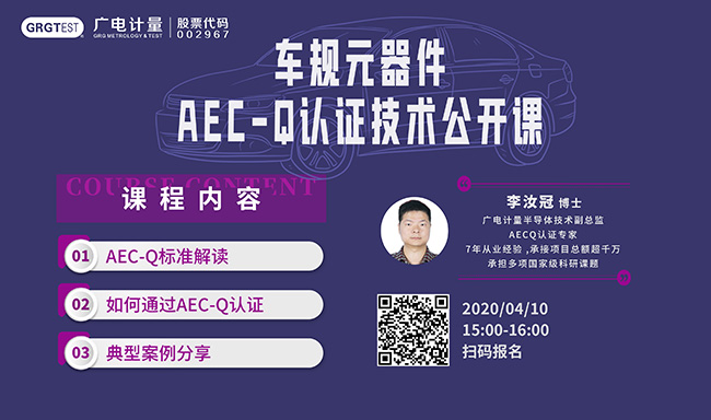 4月10日(本周五15:00-16:00),廣電計量李汝冠博士為您帶來車規元器件AEC-Q認證技術公開課,助您通過AEC-Q認證,歡迎各位朋友掃碼報名!